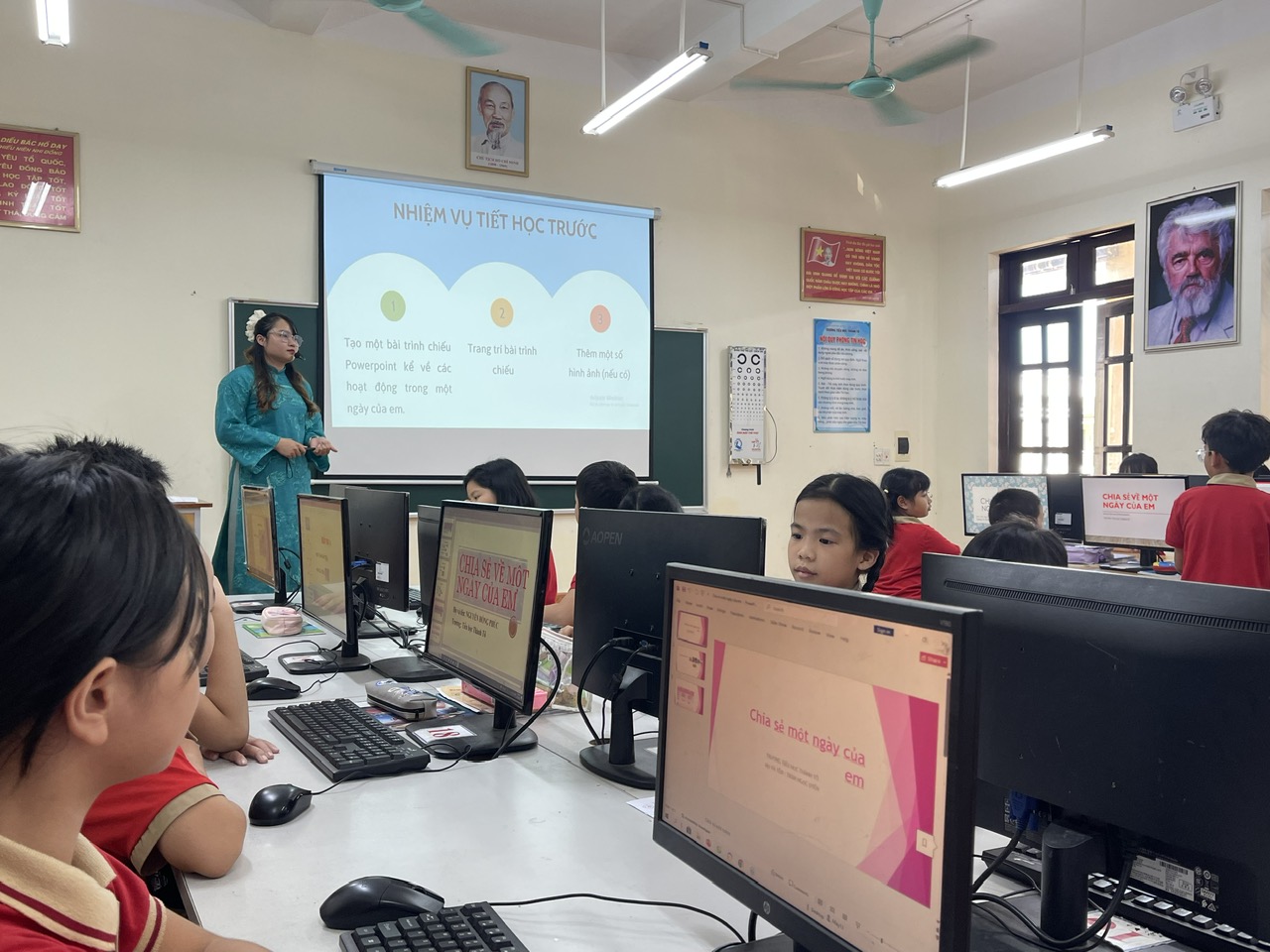 Tiết học diễn ra nhẹ nhàng, phương pháp phù hợp với nội dung bài học, hình thức tổ chức hấp dẫn lôi cuốn học sinh để học sinh tích cực tham gia các hoạt động học tập.Với Hoạt động 1 giáo viên hướng dẫn học sinh sử dụng máy tính để thu thập các thông tin, tranh ảnh về các hoạt động trong một ngày của em bằng cách lên Goole tìm kiếm để tạo Pơerpoint . Hoạt động 2 giáo viên giới thiệu cho học sinh công cụ ChatGPT để lập thời gian biểu. Sự tương tác giữa học sinh với học sinh, học sinh với giáo viên, giáo viên với học sinh trong tiết học rất tốt. Tạo tâm lí thoải mái nhẹ nhàng cho học sinh, phát huy tính tích cực chủ động sáng tạo của người học, tạo không khí lớp học sôi nổi.