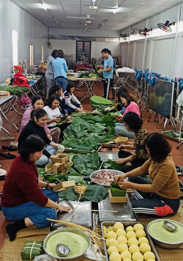 Với yêu cầu “thẩm mỹ”, “chỉn chu” được đặt ra từ Ban Chấp hành Công đoàn, tất cả nguyên liệu đã được chuẩn bị tỉ mỉ từ trước. Đến sáng, vẫn có một lực lượng “hùng hậu” tham gia rửa - lau từng chiếc lá dong, xới từng thau đậu, khay thịt nhằm đảm bảo đạt chuẩn chất lượng, vệ sinh an toàn thực phẩm.Việc thực hiện những công đoạn khác nhau như: cắt lá, cột bánh, gói bánh và nấu bánh. Mỗi khâu đều có sự đồng lòng chung sức của các thầy cô để cùng nhau tạo nên những sản phẩm đẹp mắt và chất lượng. Toàn bộ số bánh này được nấu chín và gửi về từng tổ Công đoàn đồng thời dành tặng cho các em học sinh nghèo, học sinh có hoàn cảnh khó khăn của trường.