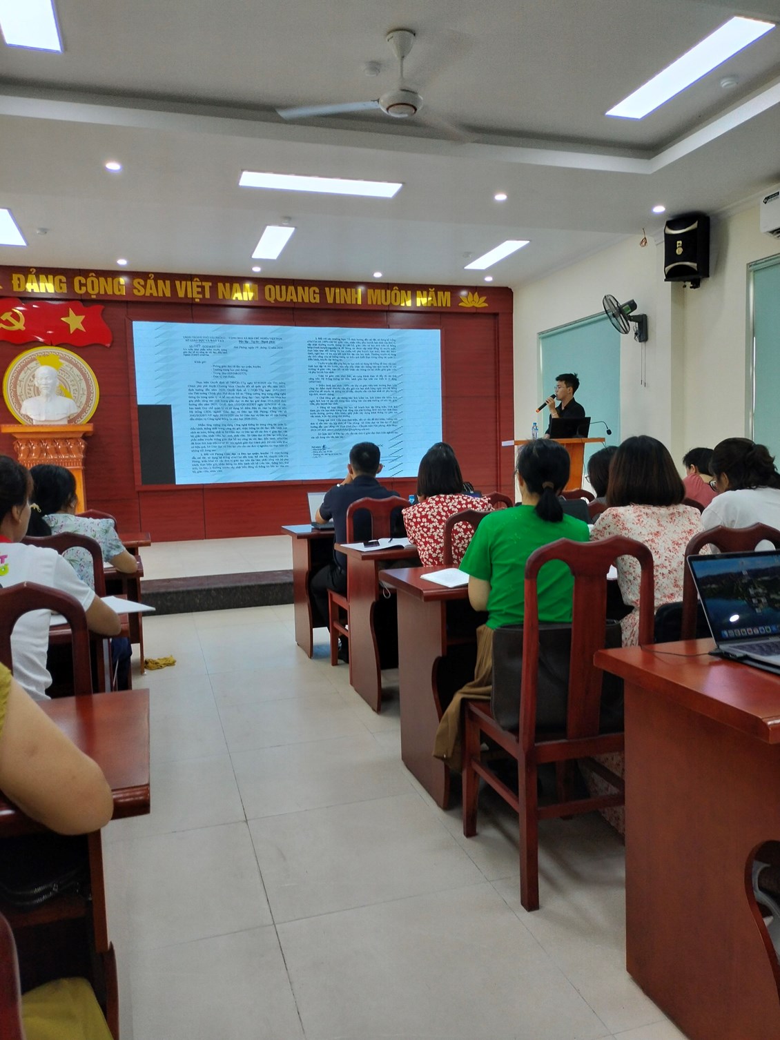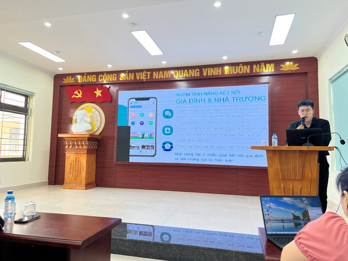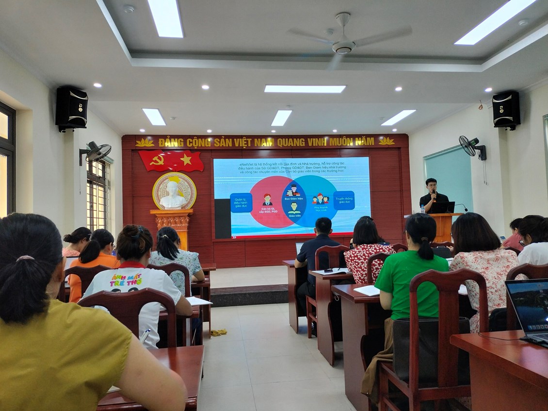 Mở đầu buổi tập huấn đồng chí Phạm Thị Huyền – Hiệu trưởng nhà trường đã giới thiệu đồng chí Tiến Duy – chuyên viên đào tạo eNetViet – CSDL ngành hướng dẫn các giáo viên cách sử dụng eNetViet và trải nghiệm các tính năng nổi bật mà eNetViet mang lại. Thông qua buổi tập huấn, cán bộ,giáo viên nhà trường đã biết cách sử dụng 4 chức năng cơ bản trên eNetViet là THÔNG BÁO - ĐIỂM DANH - HOẠT ĐỘNG - TRÒ CHUYỆN NHÓM. Đây là 4 chức năng chính sẽ hỗ trợ cả công tác điều hành, chuyên môn và kết nối giữa nhà trường và gia đình học sinh như có thể tiến hành điểm danh trực tuyến; duyệt đơn xin nghỉ học trực tuyến từ phụ huynh; nhập điểm và nề nếp cho học sinh; chia sẻ hình ảnh, hoạt động của trường, của lớp và trao đổi với phụ huynh, Ban giám hiệu và các giáo viên khác trong trường...Ngoài ra phần mềm còn giúp phụ huynh theo dõi kết quả học tập, rèn luyện của con và các thông báo, tin tức, thời khóa biểu, hoạt động mới nhất từ nhà trường, cũng như có thể xin nghỉ học trực tuyến cho con, trò chuyện với giáo viên và các phụ huynh khác trong cùng lớp học...